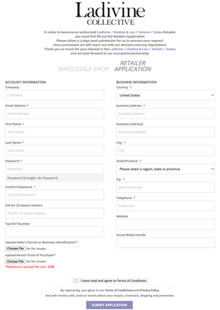 Please register here to become a retailer https://order.ladivine.com/customer/account/create/apply